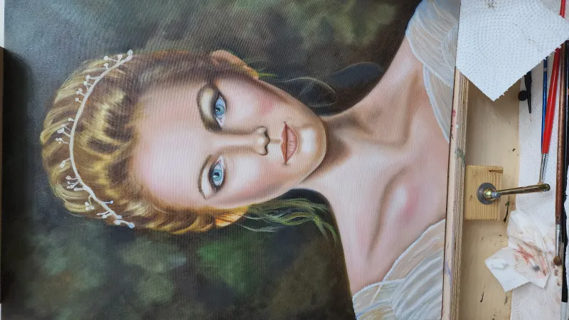 این اثر یک تابلوی پرتره رنگ روغن با حالوهوایی کلاسیک و اشرافی است. در مرکز تصویر، چهره زنی جوان با نگاهی مستقیم و آرام به بیننده دیده میشود. ترکیببندی اثر ساده و متمرکز بر صورت است؛ پسزمینه تیره و محو باعث شده چهره و جزئیات آن بیشتر جلوه کند و عمق بیشتری به تصویر بدهد. ویژگیهای هنری اثر: استفاده از تکنیک سایهروشن برای برجسته کردن فرم صورت و گونهها پرداخت دقیق چشمها با رنگ آبی روشن که نقطه کانونی تابلو محسوب میشود اجرای ظریف موها و تاج سفید ظریف که حالتی لطیف و رمانتیک ایجاد کرده است لباس با یقه باز و پارچه روشن که با نورپردازی نرم، حس لطافت را تقویت میکند قاب طلایی با نقشونگار کلاسیک، هماهنگ با فضای اثر انتخاب شده و حالتی مجلل و رسمی به تابلو داده است؛ این نوع قاب معمولاً برای پرترههای کلاسیک و آثار الهامگرفته از سبکهای اروپایی قرن نوزدهم استفاده میشود. در مجموع، این تابلو فضایی رمانتیک، آرام و نجیبانه دارد و میتواند برای دکوراسیونهای کلاسیک یا فضاهای رسمی انتخابی چشمنواز باشد.
