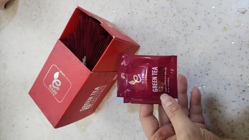 ترکیبات: پودر چای سبز، دکستروز مونو هیدرات، پودر زعفران.